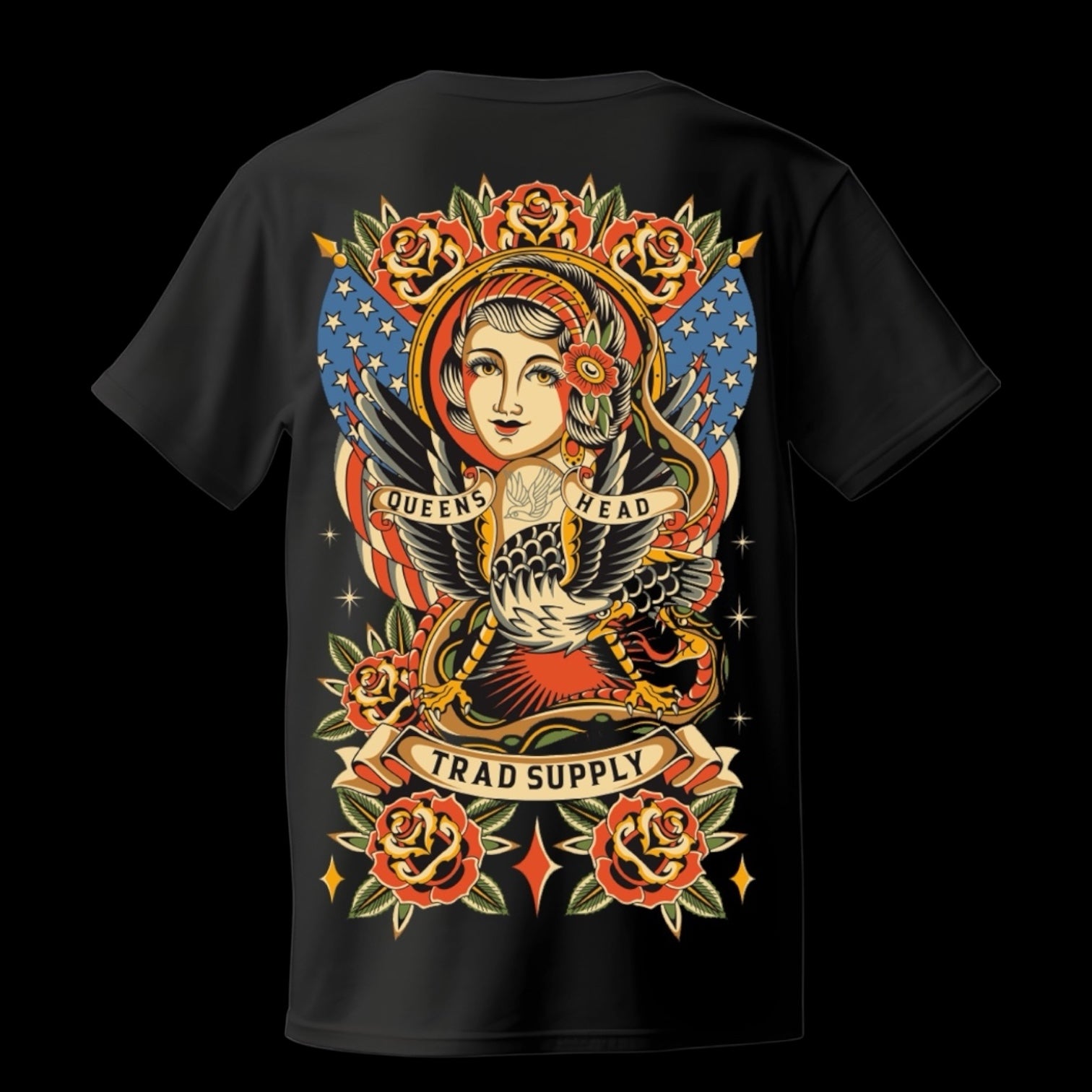 The Lady Liberty Tee pulls straight from the walls of American traditional tattoo parlors. Featuring a bold eagle and Lady Liberty, framed by American flags and roses, it’s a classic flash design that carries the grit and pride of timeless tattoo culture.